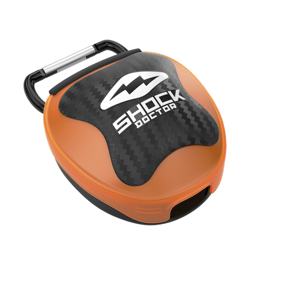 Heavy duty ventilated case with carabiner attachment system provides secure, clean storage for a single mouthguard to reduce exposure to bacteria.